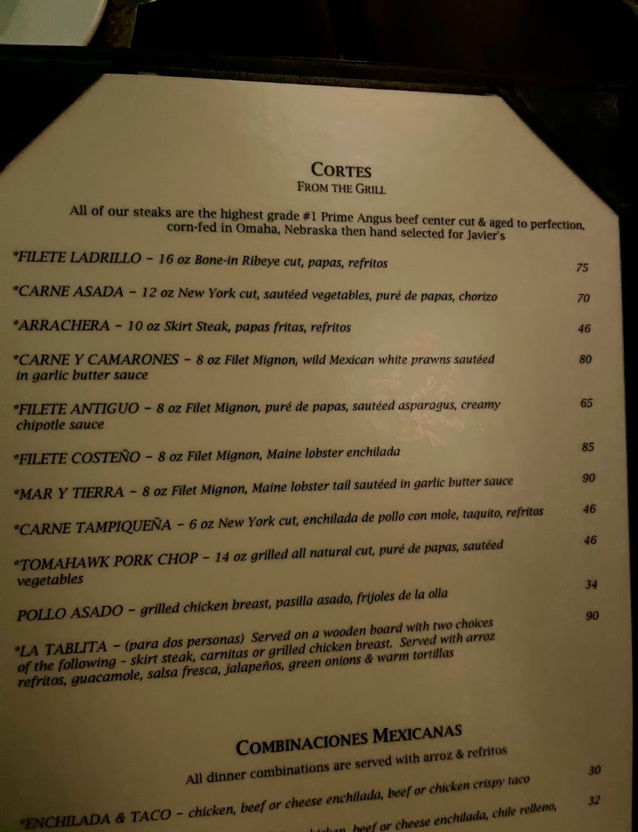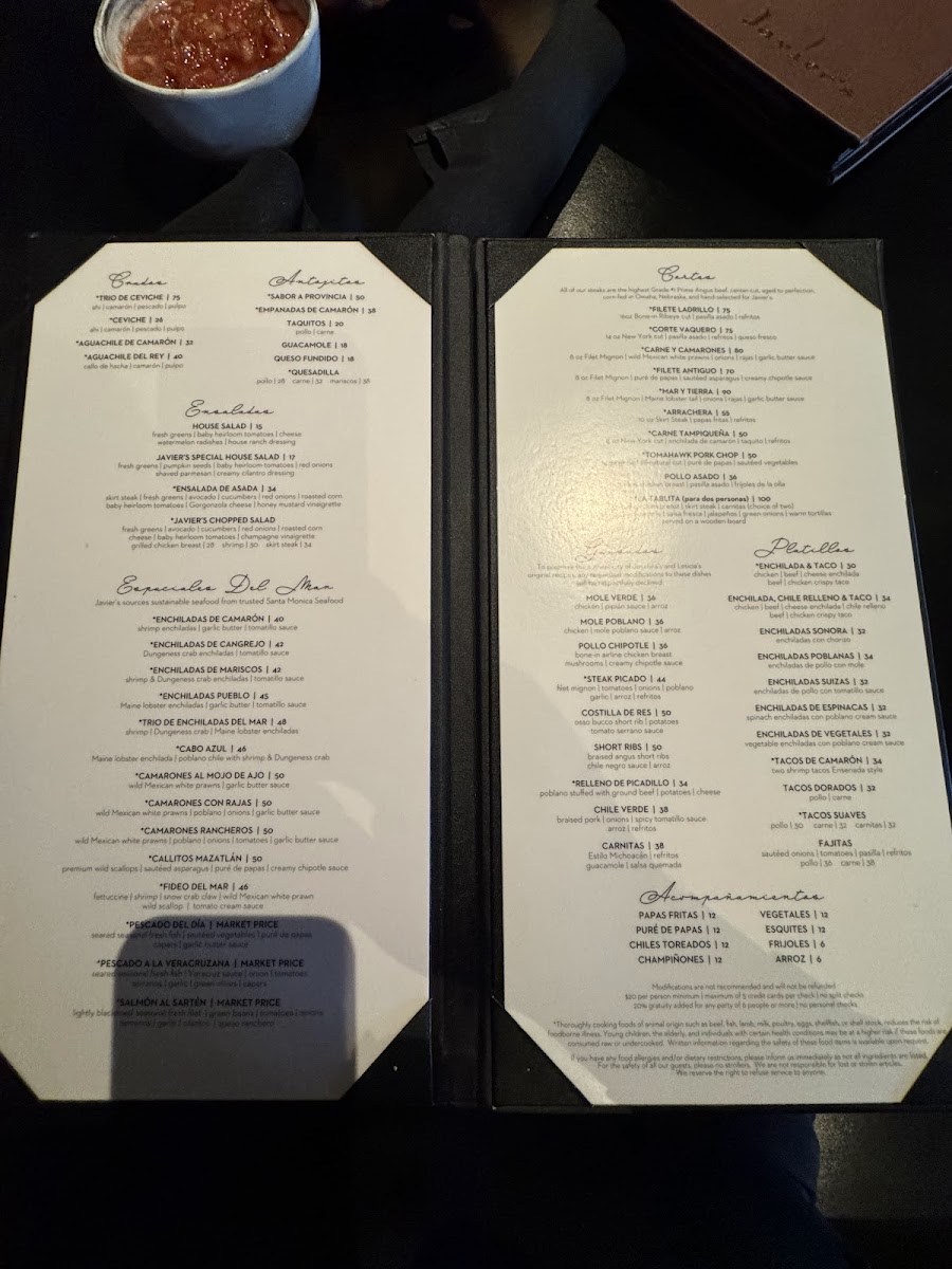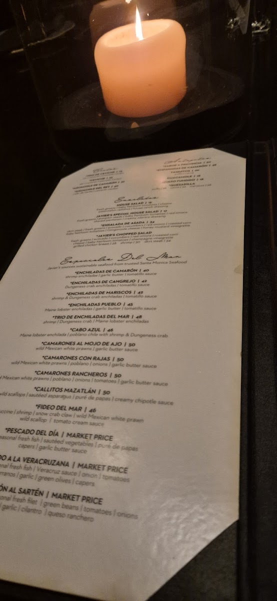 Javier's specializes in contemporary Mexican cuisine, offering a carefully curated menu that caters to various palates. Among the standout dishes, the Trio de Enchiladas Del Mar is a must-try—imagine succulent shrimp, dungeness crab, and Maine lobster enchiladas enveloped in a rich tomatillo sauce for just US$46.00. For seafood lovers, the Camarones al Mojo de Ajo features wild Mexican white prawns sizzling in a heavenly garlic butter sauce, priced at US$48.00. If steak is your craving, the Filete Ladrillo, a 16 oz bone-in ribeye, is a fantastic choice, perfectly accompanied by papas and refritos for US$75.00. The menu is enticing and diverse, promising an adventure for your taste buds with each bite.