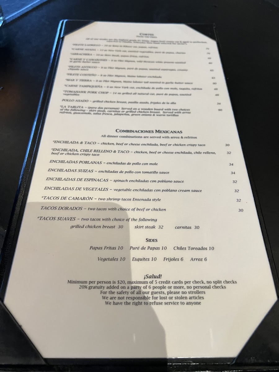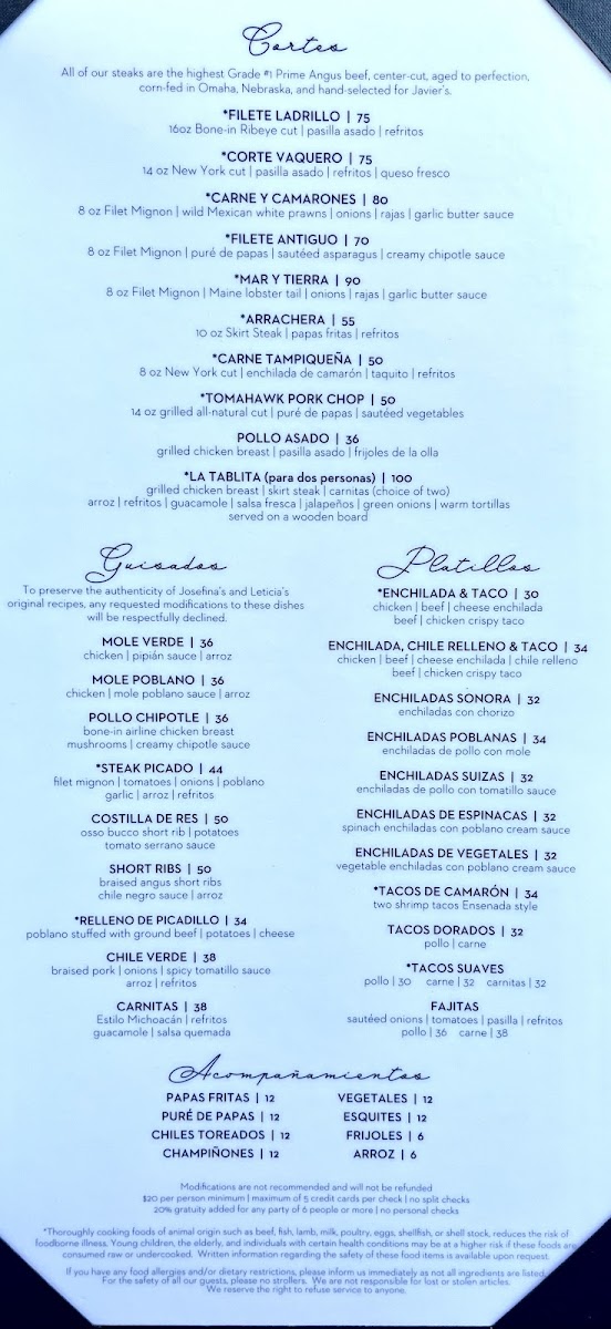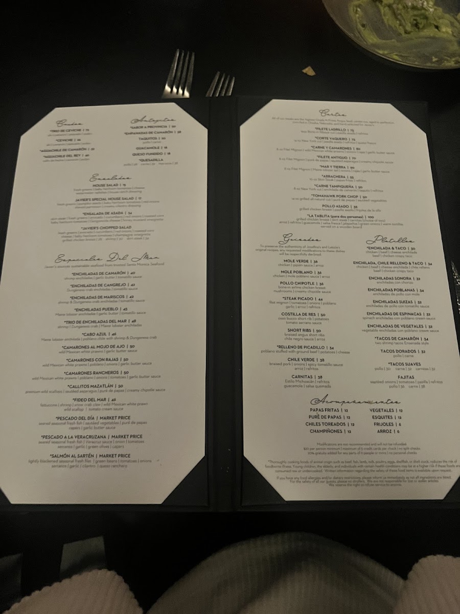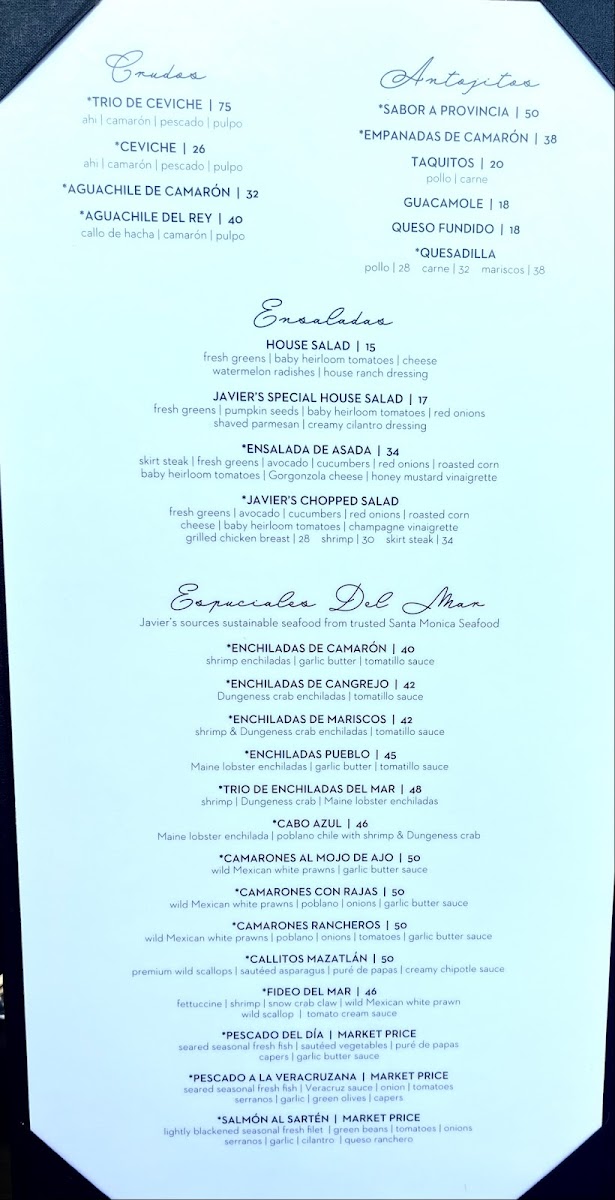 Javier's specializes in contemporary Mexican cuisine, offering a carefully curated menu that caters to various palates. Among the standout dishes, the Trio de Enchiladas Del Mar is a must-try—imagine succulent shrimp, dungeness crab, and Maine lobster enchiladas enveloped in a rich tomatillo sauce for just US$46.00. For seafood lovers, the Camarones al Mojo de Ajo features wild Mexican white prawns sizzling in a heavenly garlic butter sauce, priced at US$48.00. If steak is your craving, the Filete Ladrillo, a 16 oz bone-in ribeye, is a fantastic choice, perfectly accompanied by papas and refritos for US$75.00. The menu is enticing and diverse, promising an adventure for your taste buds with each bite.